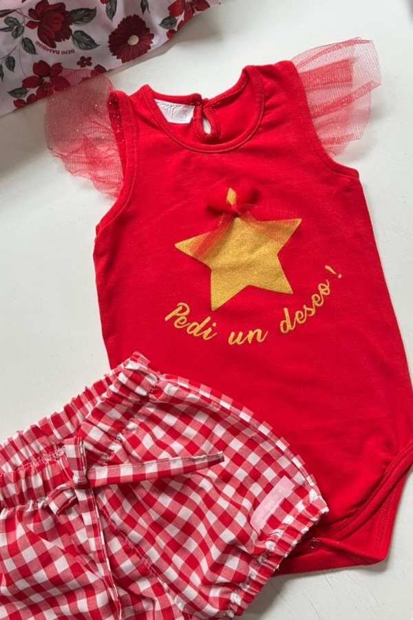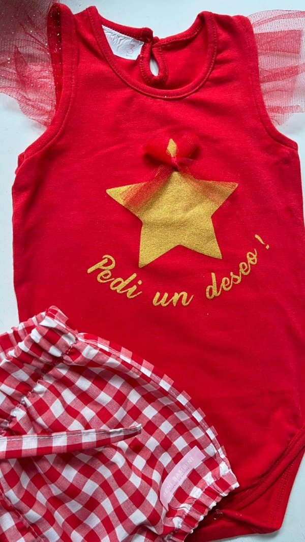 Body de algodon con estampa central, tull en hombros y moñito en estampa+ short bombachudo con lacito.