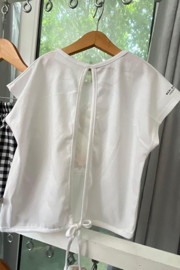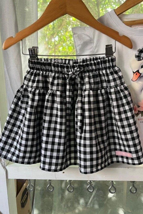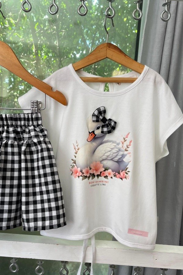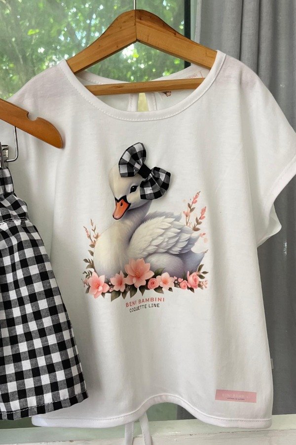 Remera de algodon manga china con estampa y lazo , espalda abierta +falda estampada cuadrille