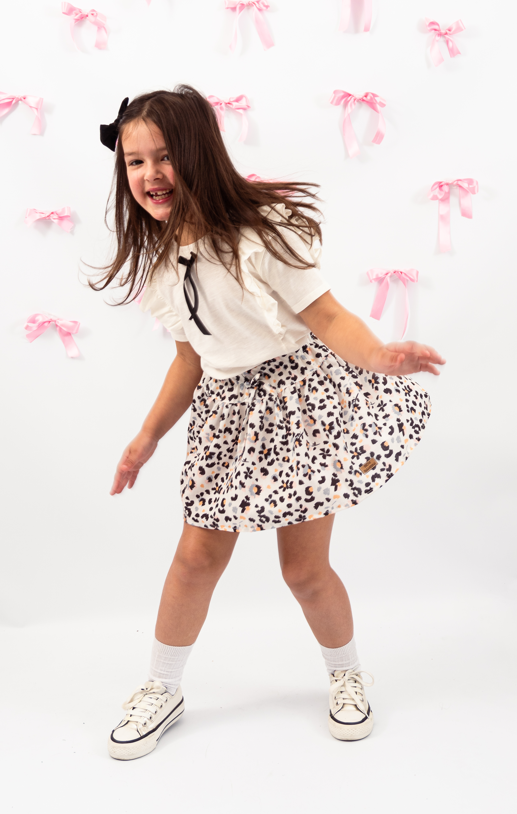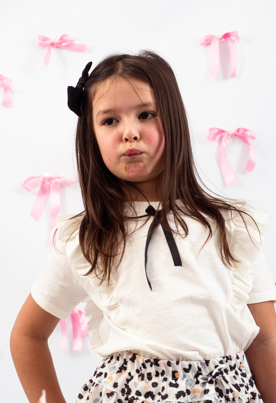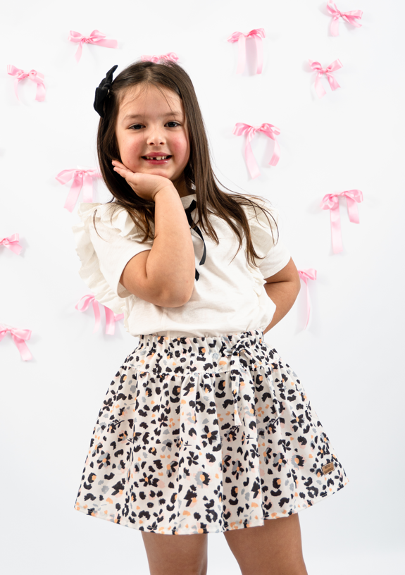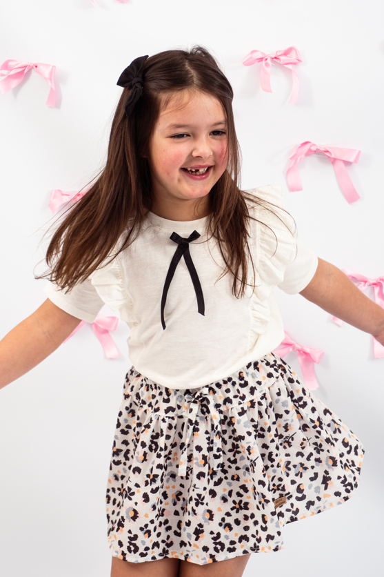 Remera de algodon con volado y lazo en color negro +falda estampada batista.