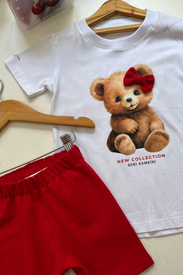 Remeron de algodon con estampa central oso con detalle de moño rojo + biker de agldon con lycra roja.