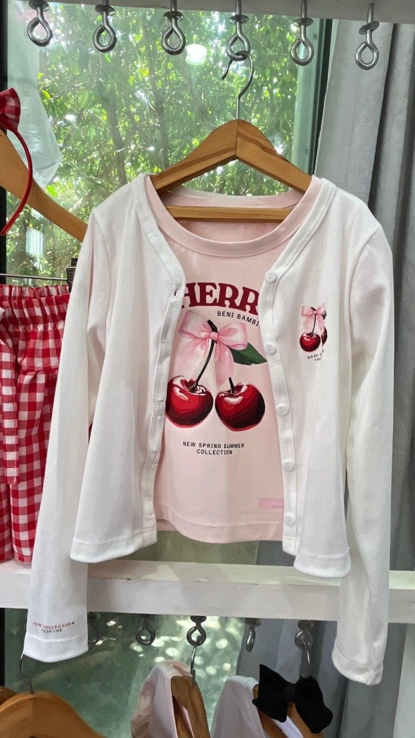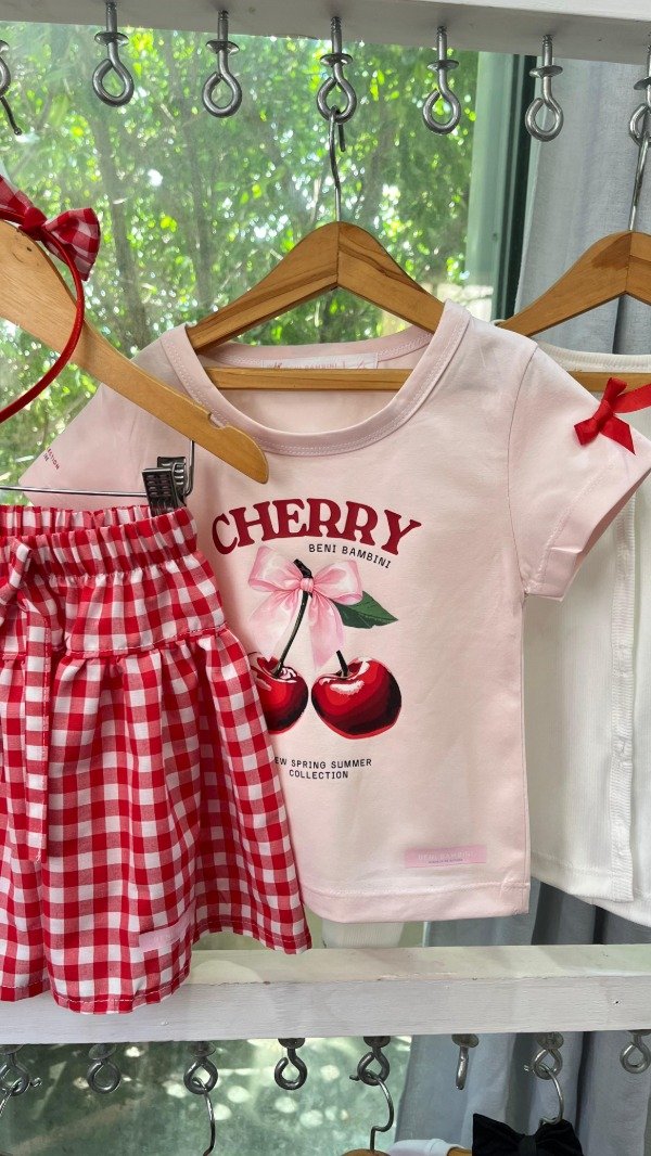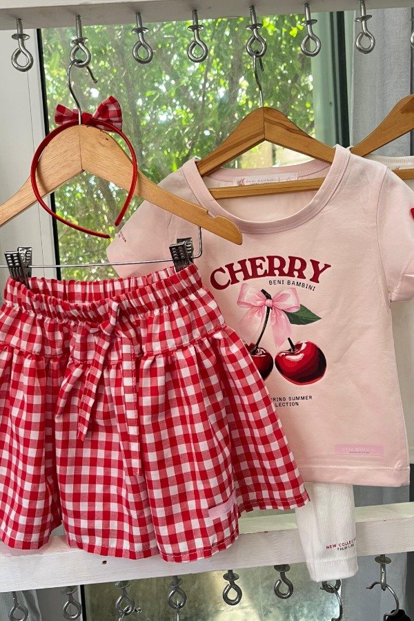 Remera de algodon con lycra y lazo en manga color rojo +falda cuadrille.
