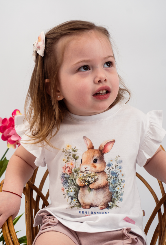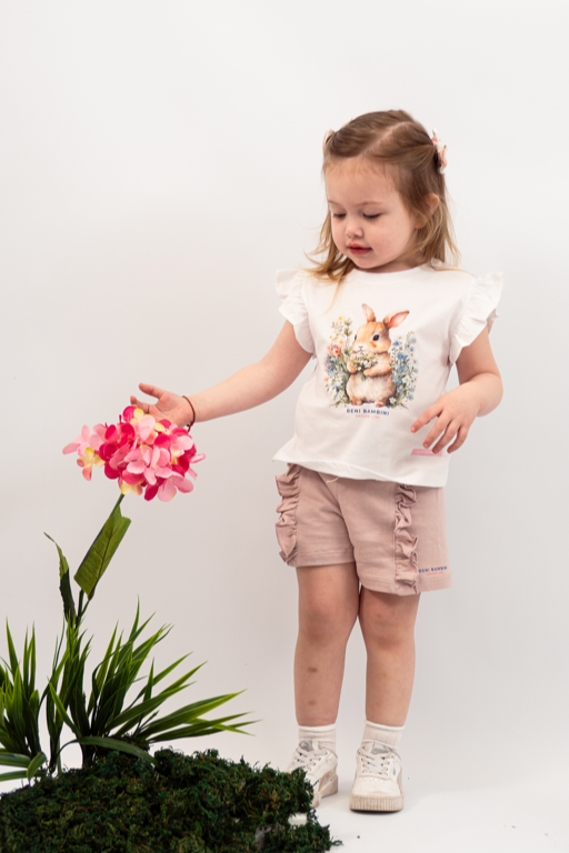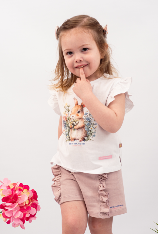 Remera musculosa con volados en hombros con estampa central +short con volados.
