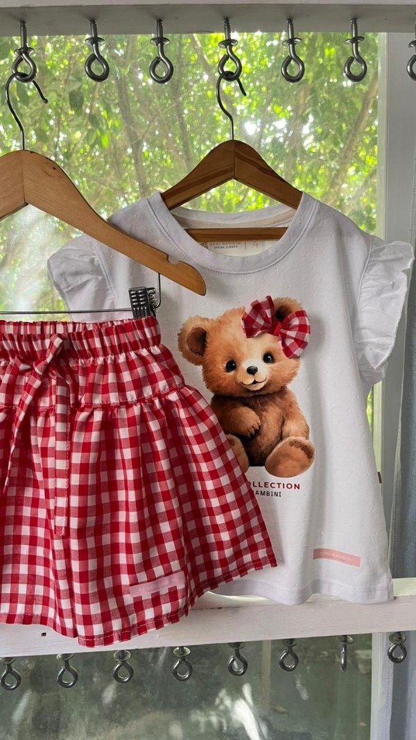 Remera de algodon labrado con volado, estampa central y lmoño +falda cuadrille