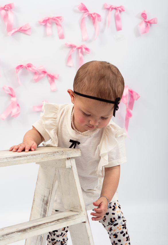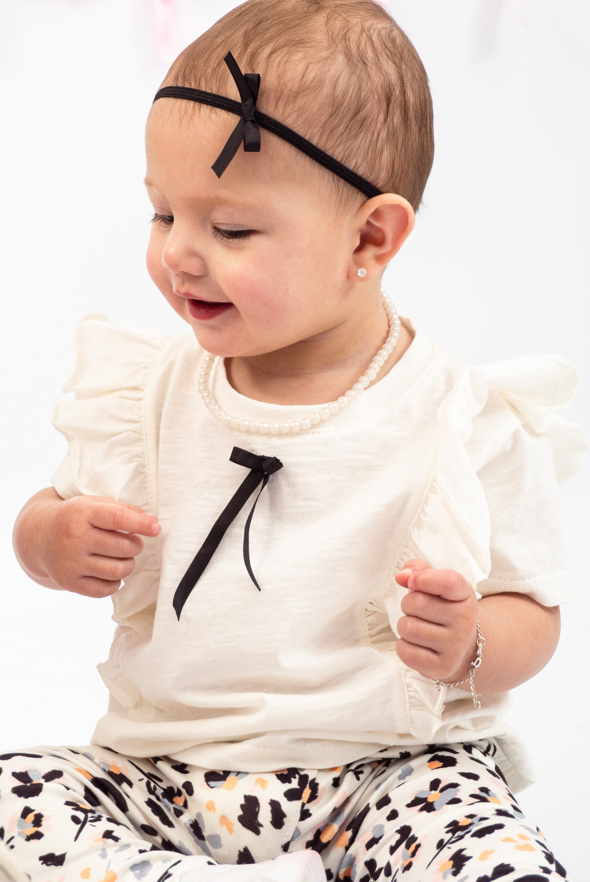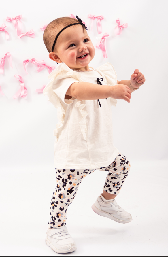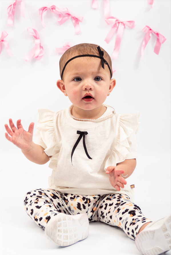 Remera de algodon flame con volados y lazo negro +calza de modal soft estampada.