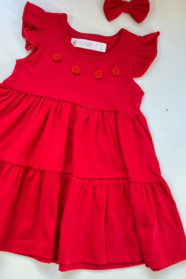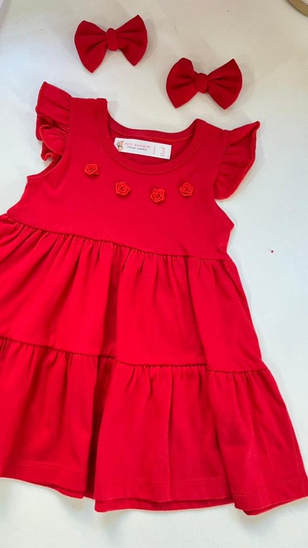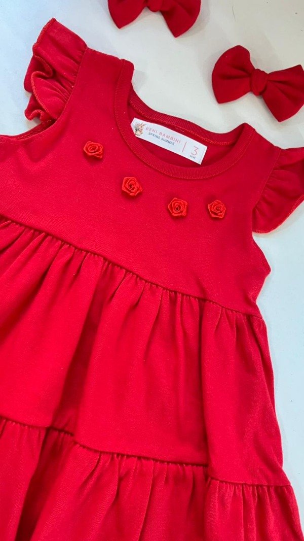 Vestido de algodon con lycra con detalle de rositas rococó, y volados en hombros.